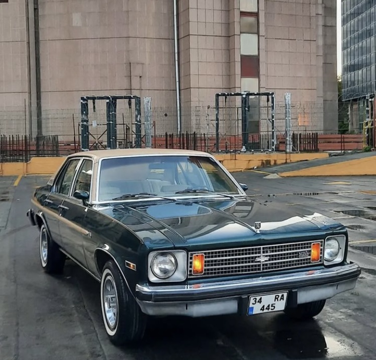 1975 Chevrolet Nova Custom fabrika özelliklerinde orijinal zümrüt yeşil fabrika renk tavan krem deri kadife fabrika döşemeleri ile yıl 1975 aracımız klimalı otomatik döneminin full özelliklerine sahip fabrikasyon bir araçtır. Dizi klip moda film çekim ve organizasyonlar tercih edilir.